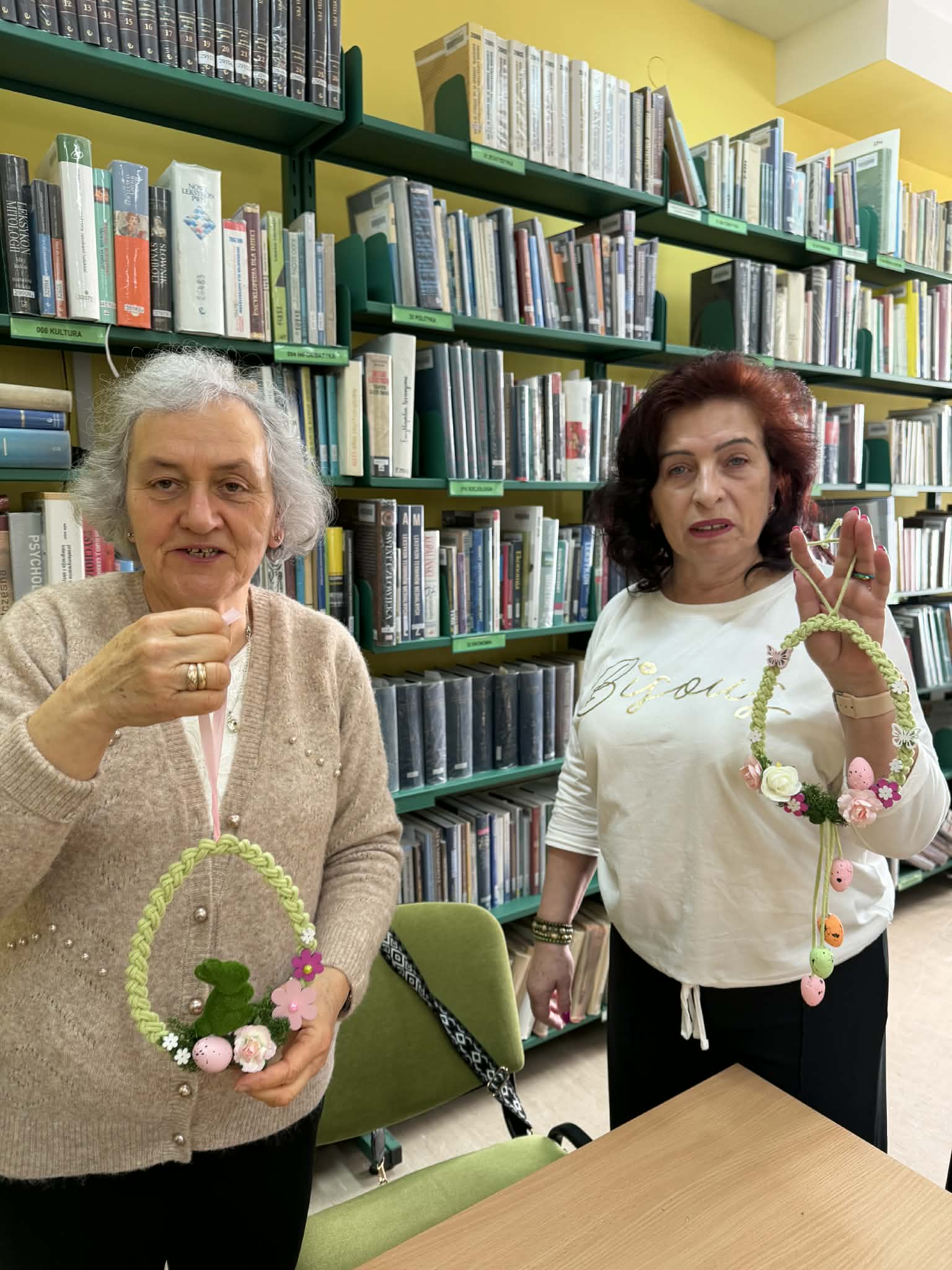 Grupa „Aktywni w bibliotece” znów pokazała swoją kreatywność! Podczas dzisiejszych zajęć powstały wyjątkowe rękodzieła wielkanocne – jaja wykonane techniką makramy na obręczy, ozdobione pięknymi, wiosenno-świątecznymi akcentami. Zobaczcie sami, jakie cuda udało się stworzyć! 🌿🐣