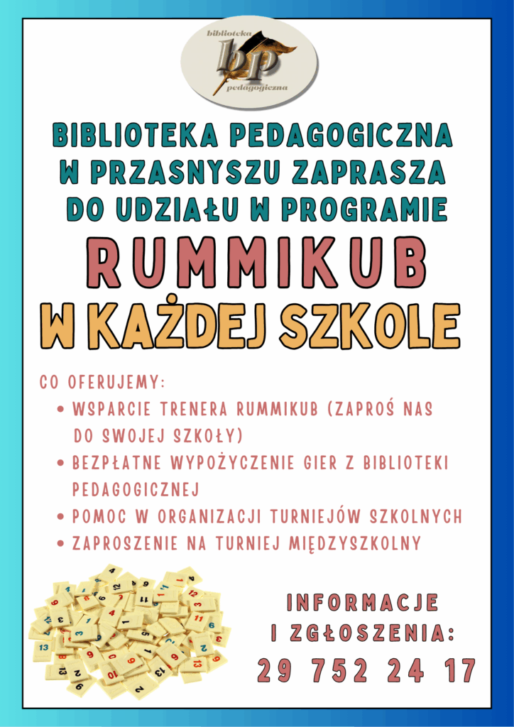 Zapraszamy dyrektorów i nauczycieli szkół podstawowych i średnich do udziału w nowym projekcie biblioteki Pedagogicznej w Przasnyszu „Rummikub w każdej szkole”.