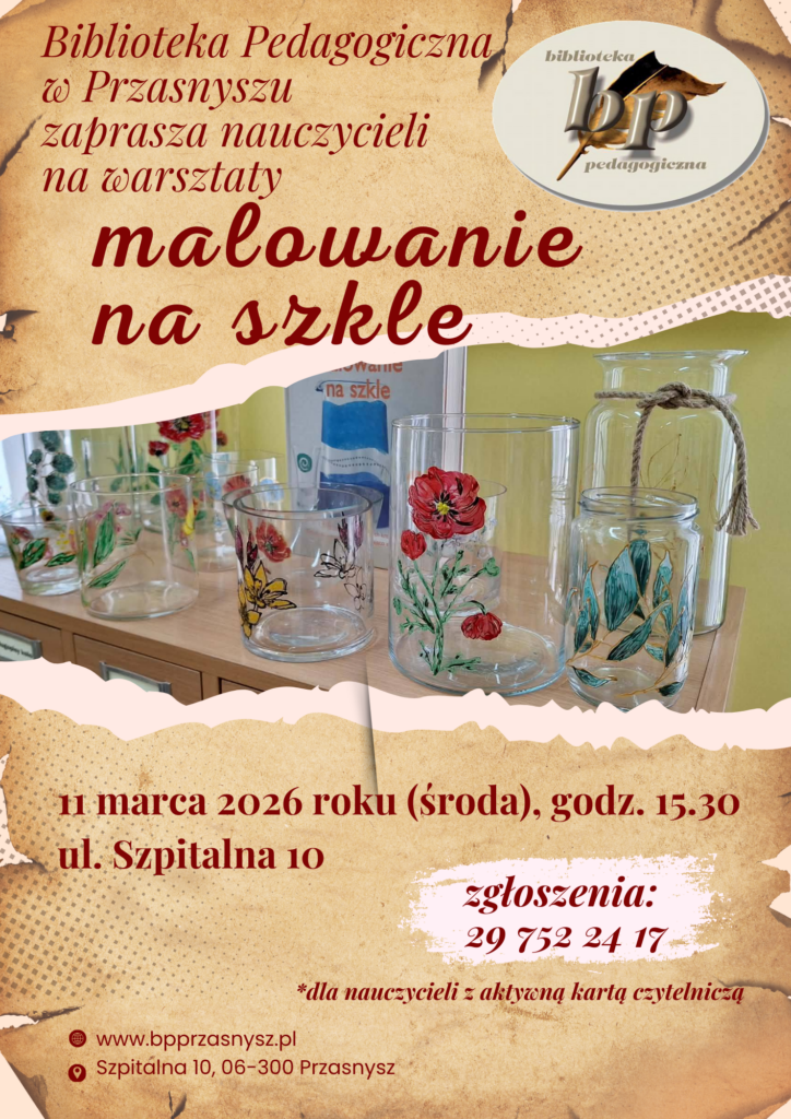 Serdecznie zapraszamy zainteresowanych nauczycieli na warsztaty malowania na szkle. Spotykamy się w środę 11. marca o godzinie 15.30 w Czytelni Biblioteki Pedagogicznej w Przasnyszu, ul. Szpitalna 10. Warsztaty poprowadzi nauczyciel bibliotekarz z naszej placówki – Agnieszka Leszczyńska. Zgłoszenia telefoniczne: 29 752 24 17.